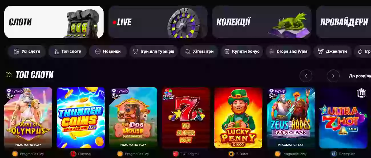 - Хітові ігри, Купити бонус, Drops and Wins – добірки зі спеціальними функціями