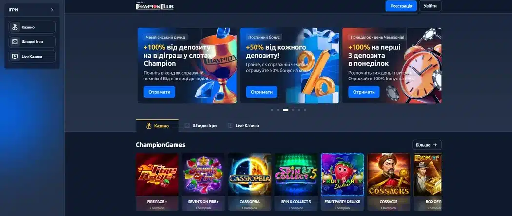 ChampionClub — це легальне українське онлайн-казино, засноване у квітні 2024 року компанією ТОВ «Маліна» та ліцензоване КРАІЛ (№ 184 від 4 квітня 2024 р.). Платформа пропонує понад 1000 ігор від 50+ провайдерів, включно з ексклюзивними розробками ChampionStudio.net, слоти, live-казино та швидкі ігри. Дизайн у синіх тонах із простим меню й пошуком, доступна гривня, депозити від 100 ₴ та вивід від 300 ₴, верифікація через Дію або BankID. Вітальний пакет до 1000 % або 299 900 ₴, регулярні акції, персональні бонуси без відіграшу, мобільна версія та PWA-додаток. Серед плюсів — легальний статус, великий вибір ігор, бонусна гнучкість, швидка підтримка; серед нюансів — обов’язкова верифікація перед виплатою та короткі строки відіграшу деяких акцій. Запитати в ChatGPT