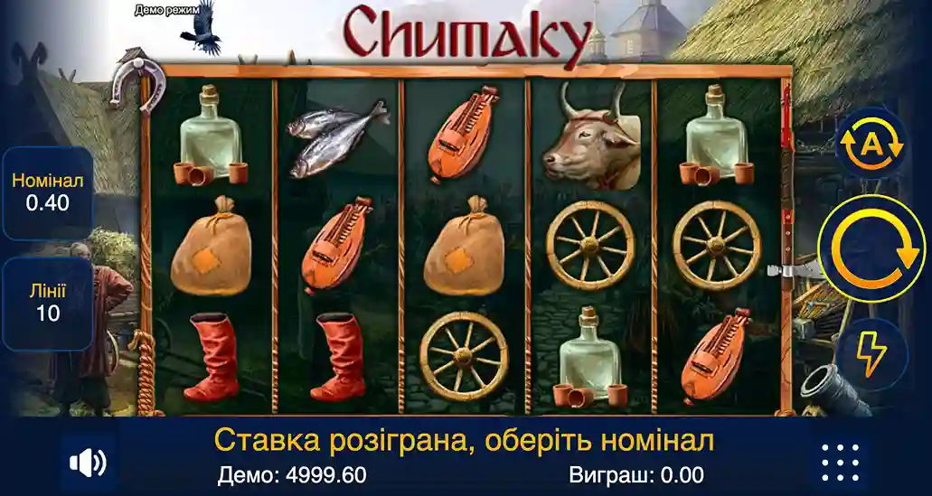 Звуковий супровід доповнює візуальний ряд: в грі лунають народні мотиви, дзвін бубнів чи стукіт коліс, що створює автентичну атмосферу подорожі. Музика підкреслює національний колорит і додає азарту кожному обертанню барабанів. Ефекти при виграшах – такі як характерні українські мелодії або вигуки – підсилюють відчуття свята, немов гравець сам прибув на ярмарок з успішним товаром. Зображення: Скріншот ігрового автомата Chumaky з барабанами та символікою української тематики