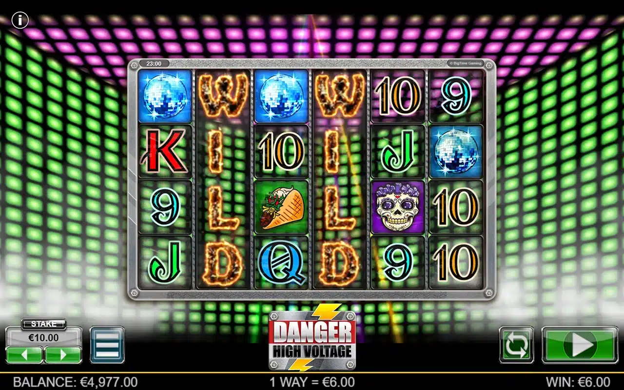 Danger High Voltage – це 6-барабанний слот, що надає аж 4 096 можливих комбінацій для виграшу. Він не схожий на класичні фруктові автомати: у грі немає фіксованих ліній виплат. Виграш зараховується за повторювані символи на сусідніх барабанах зліва направо, незалежно від їх розташування. Такий підхід означає, що кожен спін може стати виграшним, адже комбінація може скластися будь-де на екрані – можливості для великих призів тут буквально на кожному кроці.